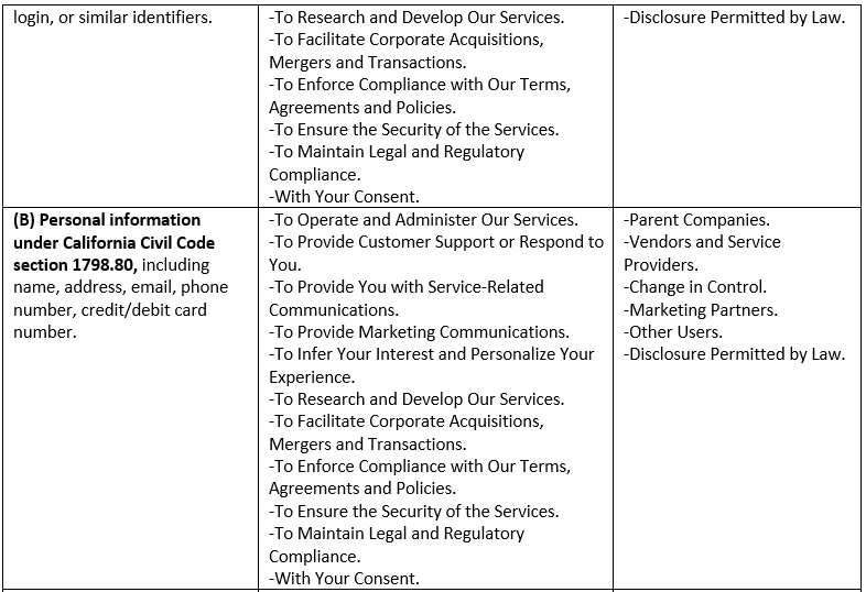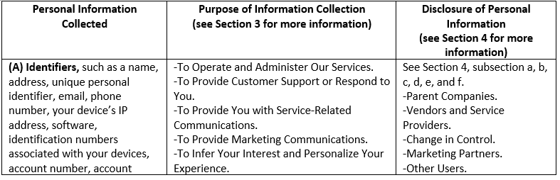 In the preceding 12 months, depending how you interact with our Services, the chart below describes the categories of personal information collected (as defined under Cal. Civ. Code §1798.140(v)(1)), the sources and purpose of such collection, and the parties to whom the information was disclosed for business purpose.