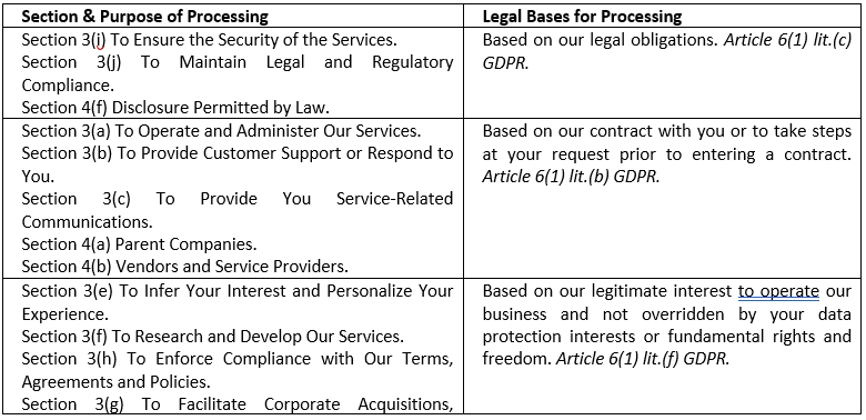 Legal Bases for Processing Your Personal Information