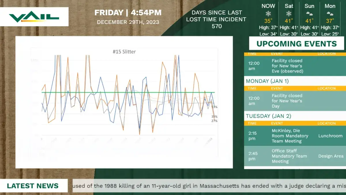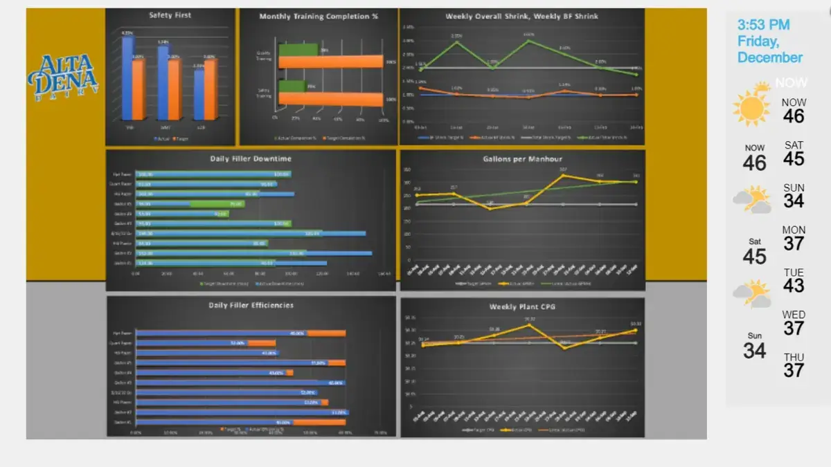 Displaying corporate and production metrics through production digital signage is a quick and easy way to ensure your business is set to meet its goals. With PowerBi and Excel integration, complex info can be distilled into accessible data charts and graphs.